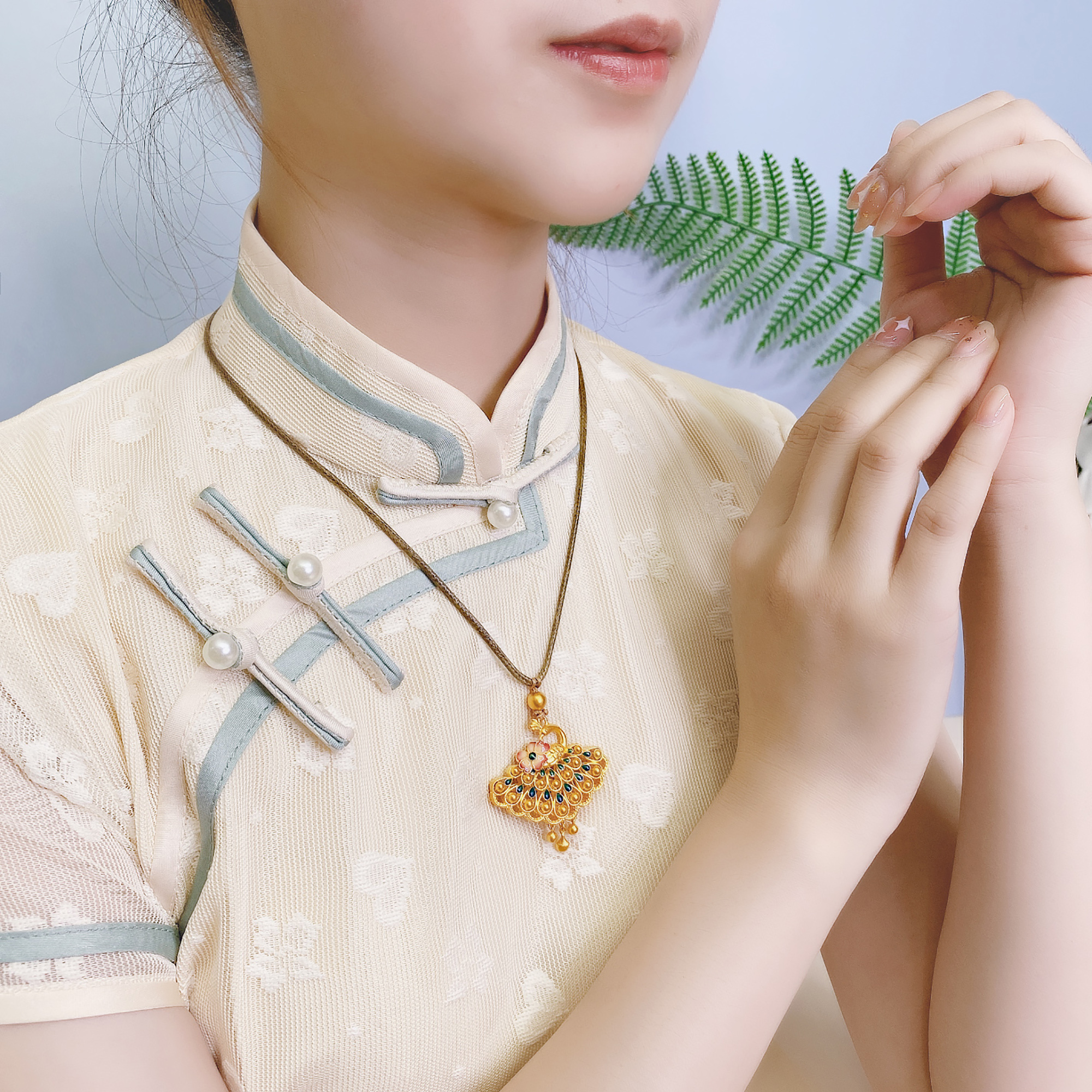 古法经典蝴蝶花卉螺钿珍珠项链