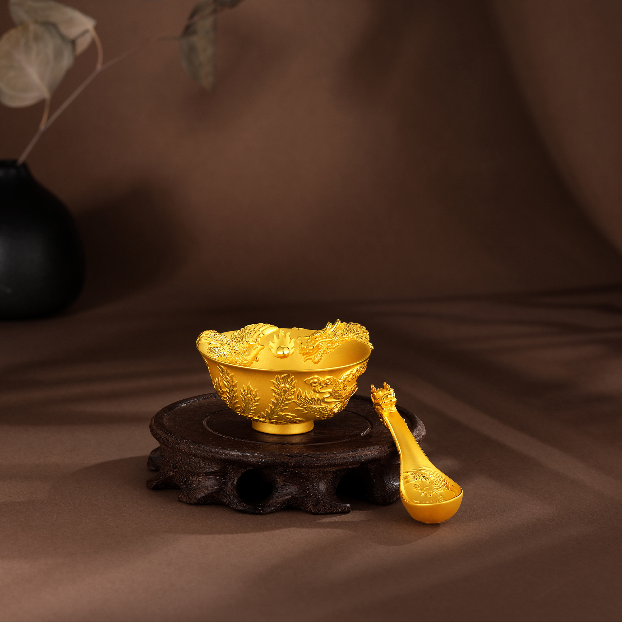 3D硬金经典立体龙凤呈祥金碗投资摆件