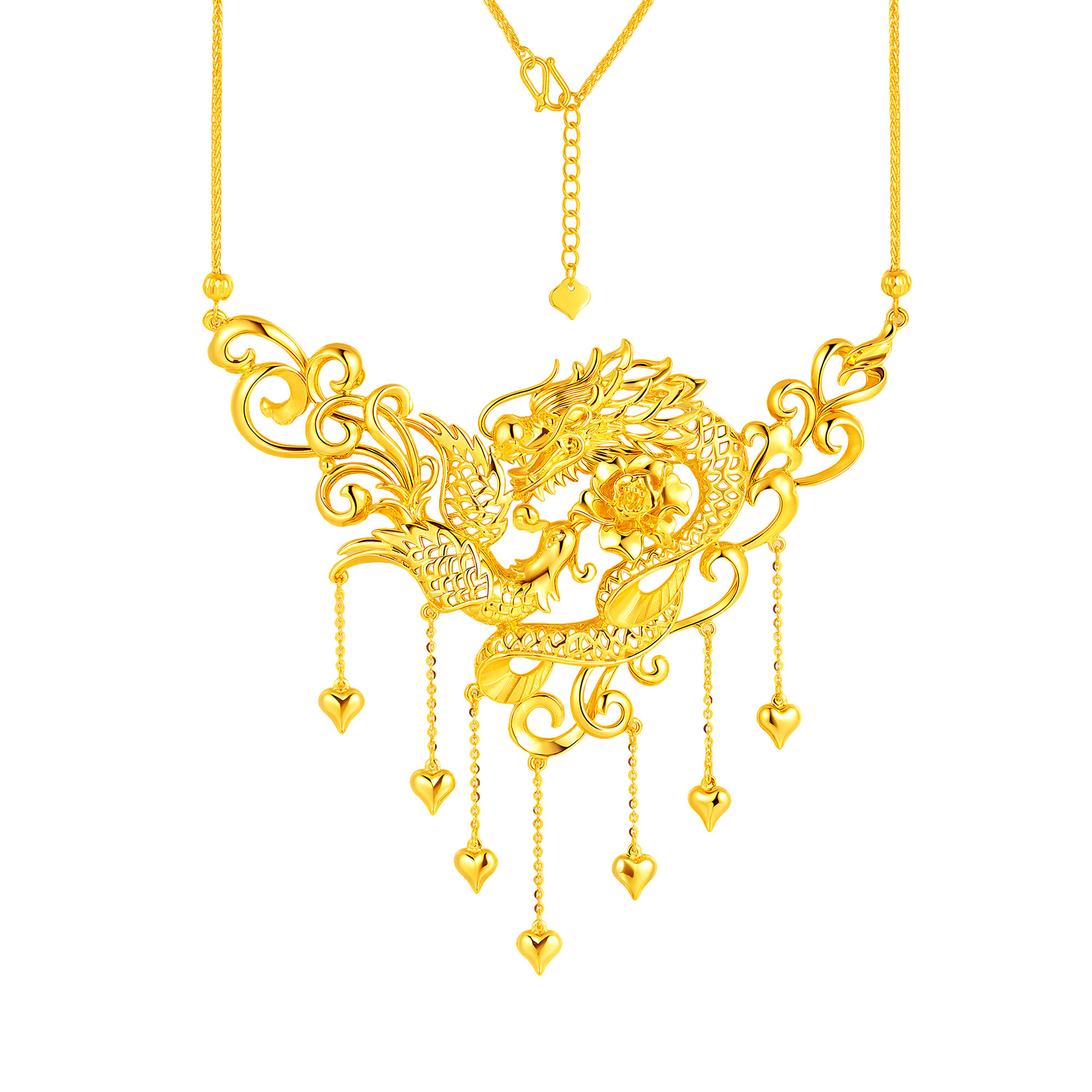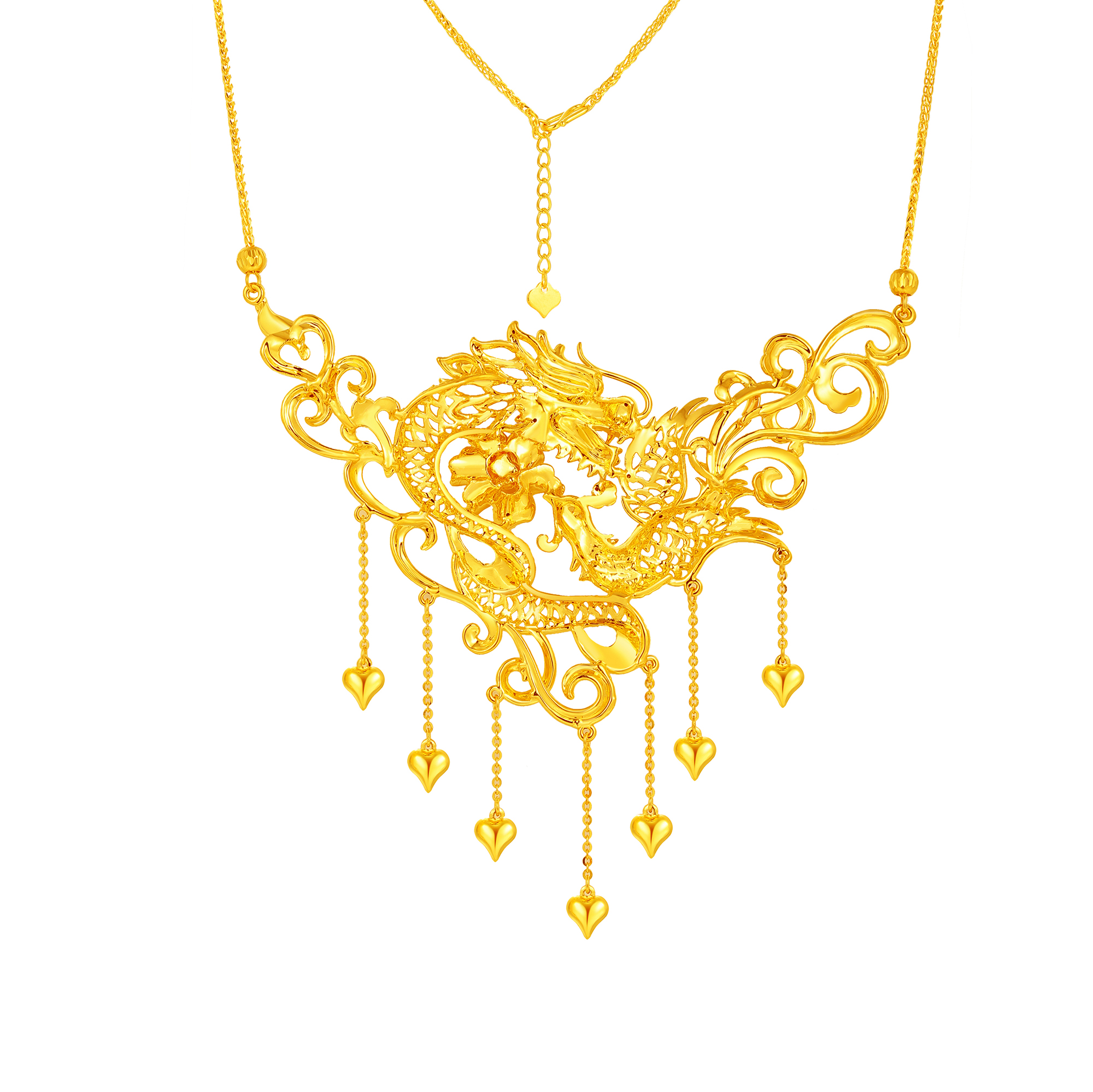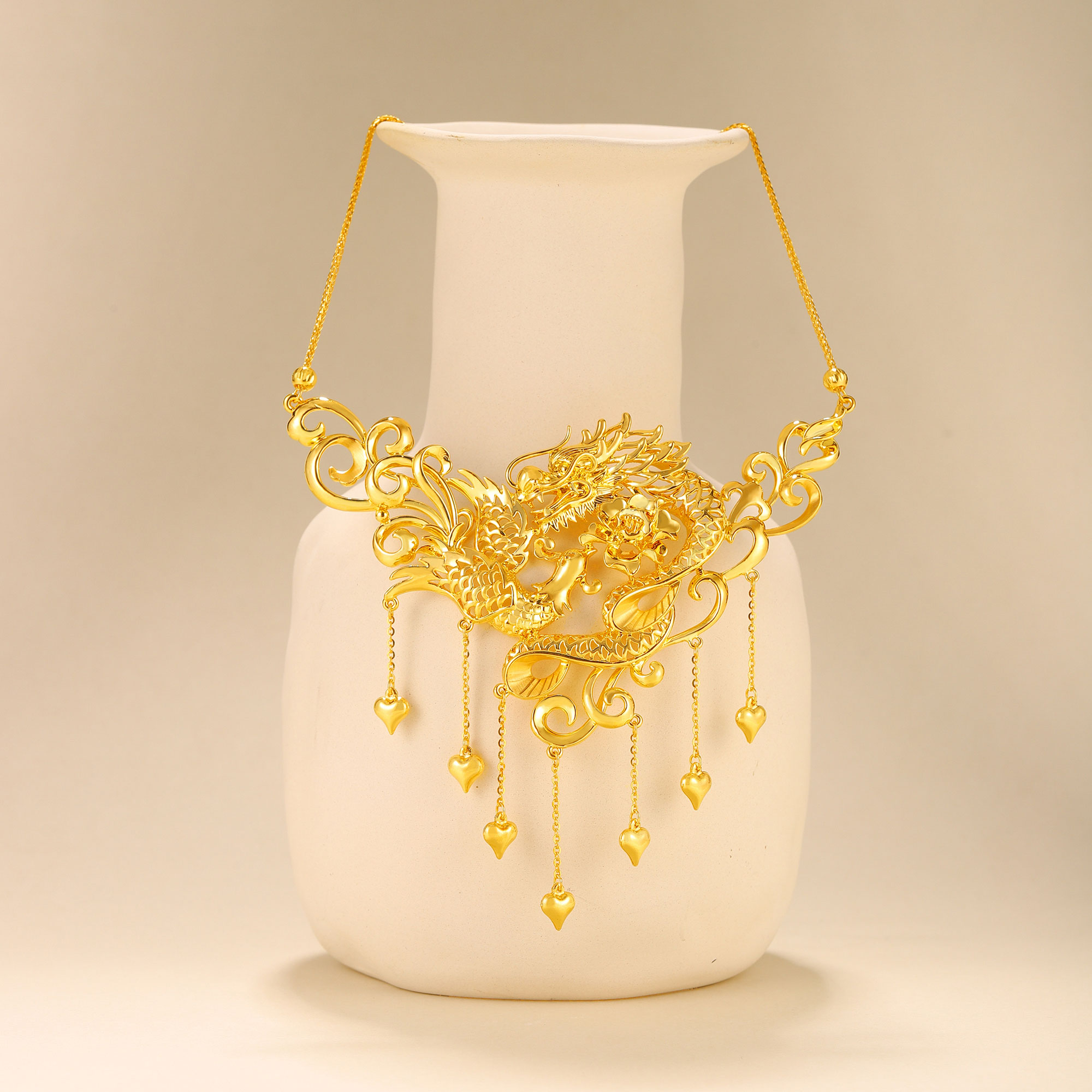 >>无氰硬金龙凤花卉流苏心形婚庆套链