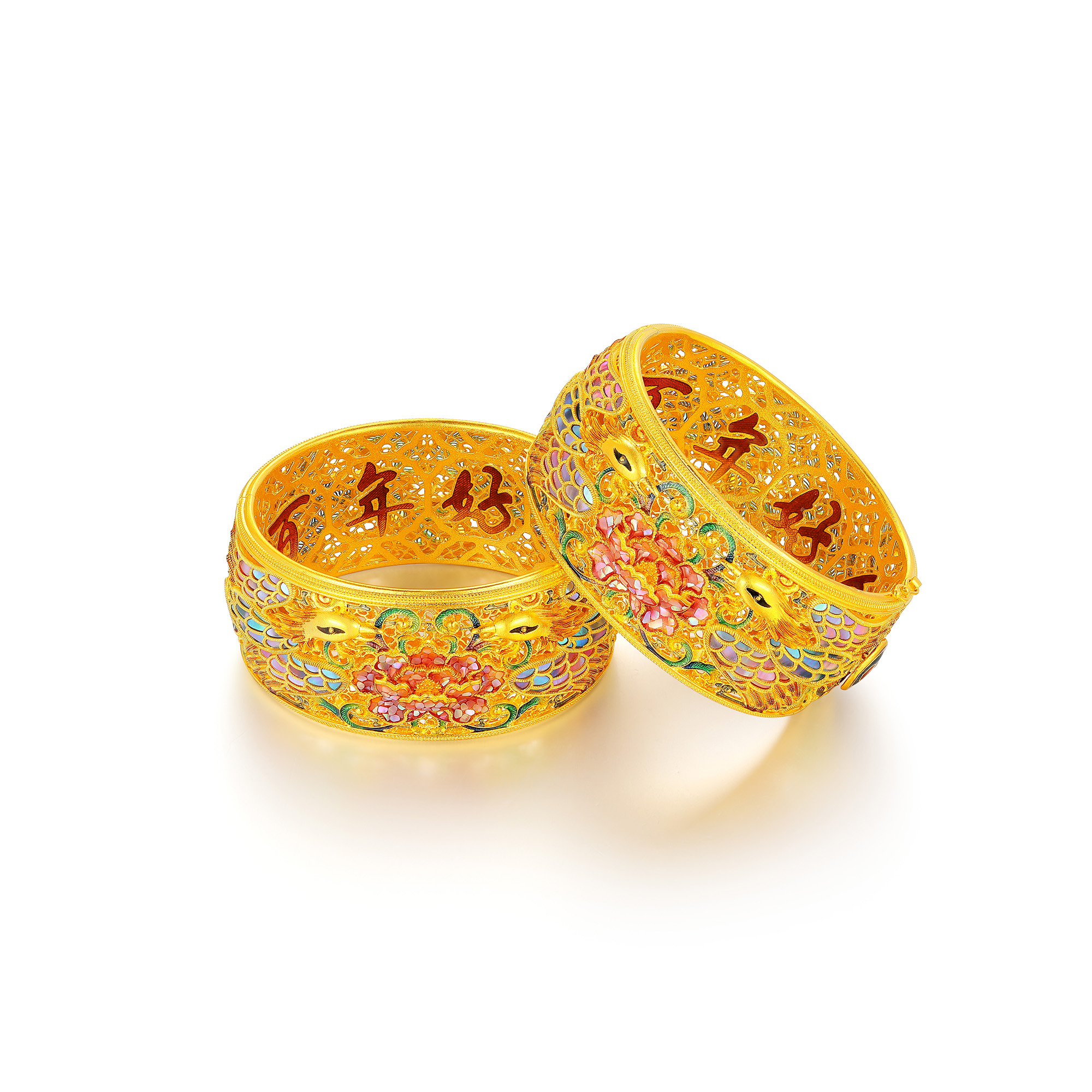 古法婚庆护佑龙凤呈祥螺钿鎏彩卡扣手镯