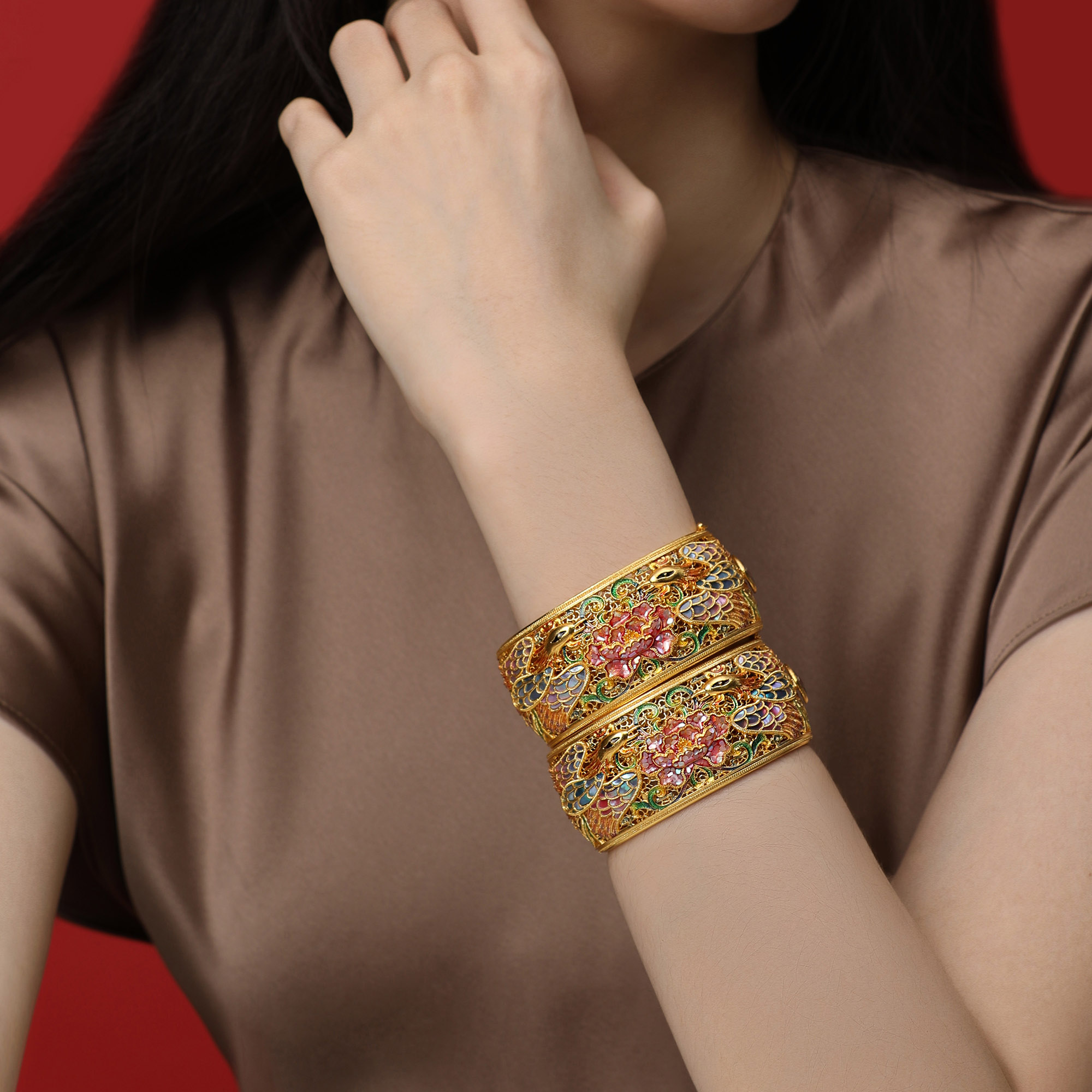 >>古法婚庆护佑龙凤呈祥螺钿鎏彩卡扣手镯