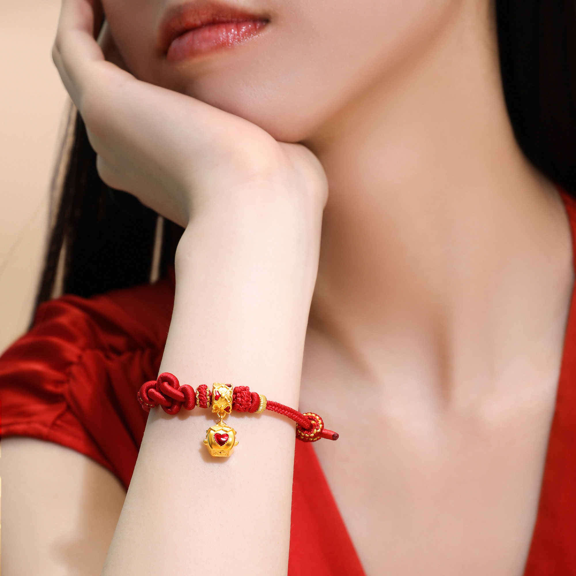 >>无氰硬金婚庆花轿爱心鎏彩手绳转运珠